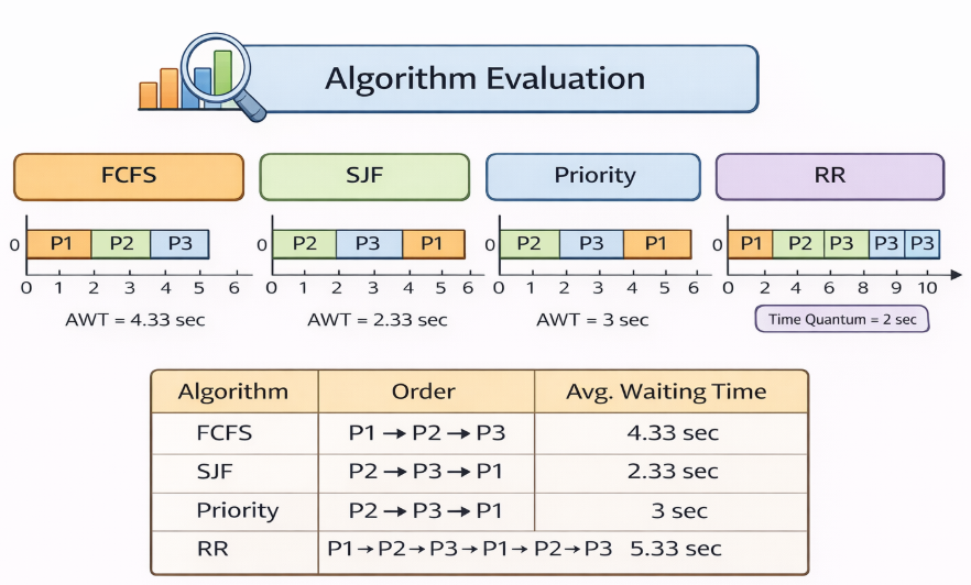 Algorithm Evaluation рд╡рд╣ process рд╣реИ рдЬрд┐рд╕рдореЗрдВ рд╣рдо different scheduling algorithms рдХреА performance рдХреЛ compare рдХрд░рддреЗ рд╣реИрдВред